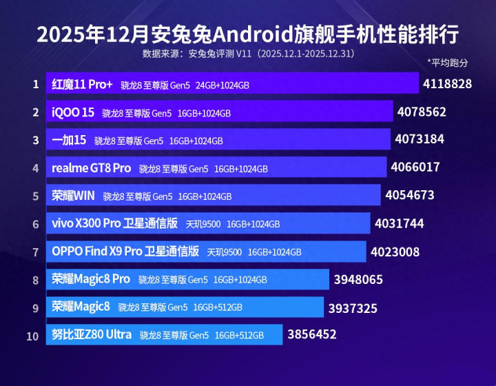 今天共享的是安兔兔Android旗舰性能榜,因为新机发布等身分,本月榜单和11月比较有明显的改革,惟一的意象之中是跑分遥遥跳跃的红魔11 Pro+。其中变化最大的应该是一加15,从第八名提高到了第三名,平均跑分从385.5万+提高到了407.3万+。新增的两款新机为荣耀WIN和努比亚Z80 Ultra,其中第又名和第十名跑分差距为26.2万+,以下是榜单的详备本色。