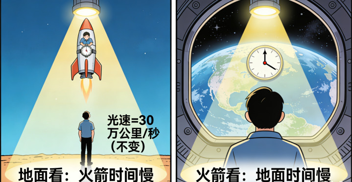 举个例子:你在原地开放手电筒,光1秒跑30万公里;我坐着15万公里/秒的火箭追光,你合计光相对我只跑15万公里/秒,但本体上我看到的光速已经30万公里/秒!为了让这个“矛盾”设置,技艺和空间必须“调和”——我的技艺变慢了,空间被压缩了。