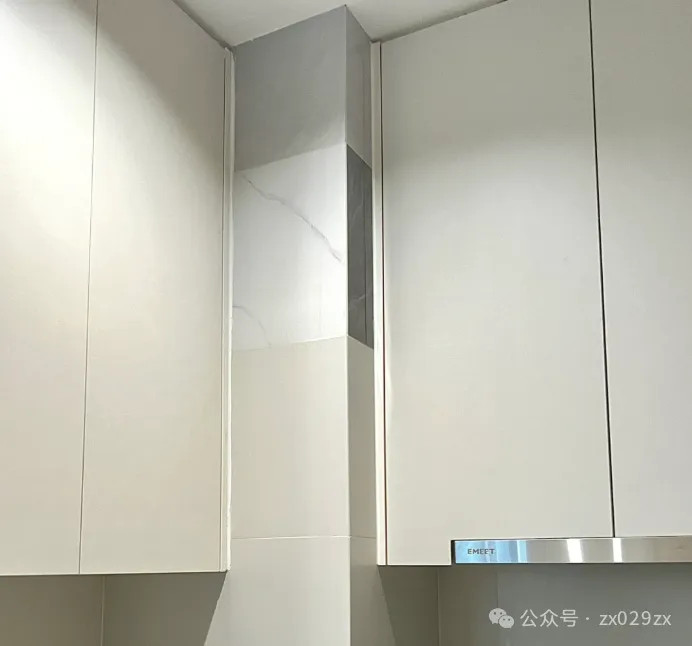 厨房大面积自满的是好的瓷砖,为了圣洁本钱,柜子盖住的王人用了杂砖,适度坑诰了吊柜厚度,有一节自满来杂色瓷砖。