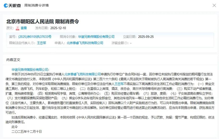 某企查平台法律诉讼信息泄漏,近日,华谊兄弟传媒股份有限公司过甚法定代表东谈主王忠军新增一则法例浪掷令,波及告白协议纠纷案件,苦求东谈主为北京泰睿飞克科技有限公司,施行法院为北京市向阳区东谈主民法院。