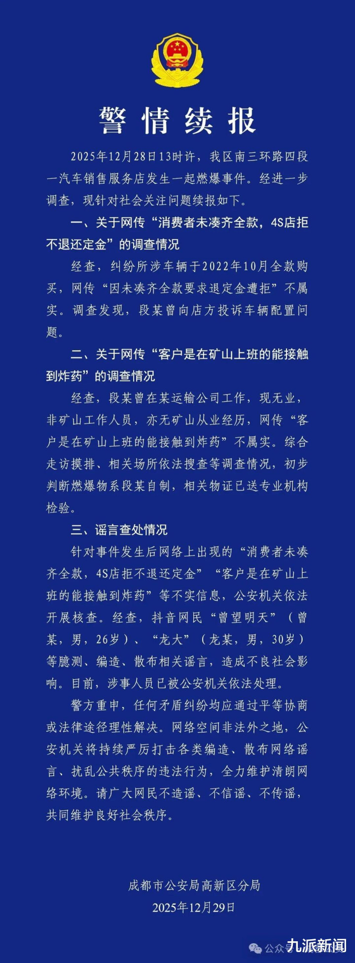 2025年12月28日13时许,我区南三环路四段一汽车销售劳动店发生总共燃爆事件。经进一循序查,现针对社会矜恤问题续报如下。